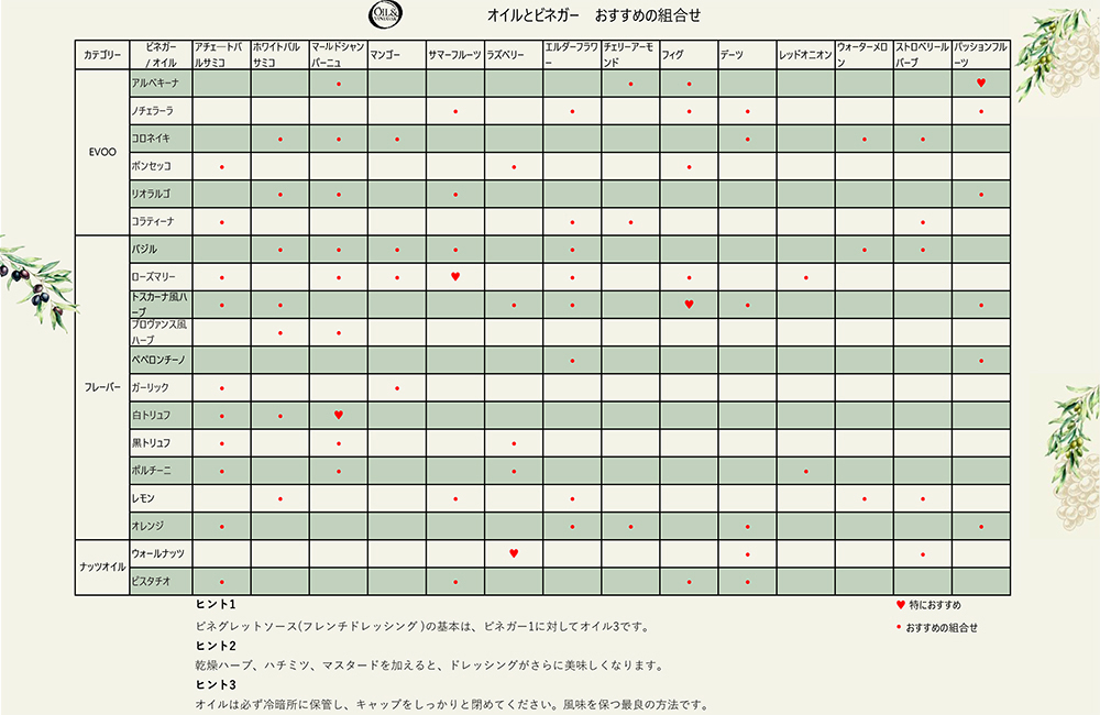 オイルとビネガーは、実はとっても万能。とっておきのペアリングをご提案します!(画像のタップで拡大します)