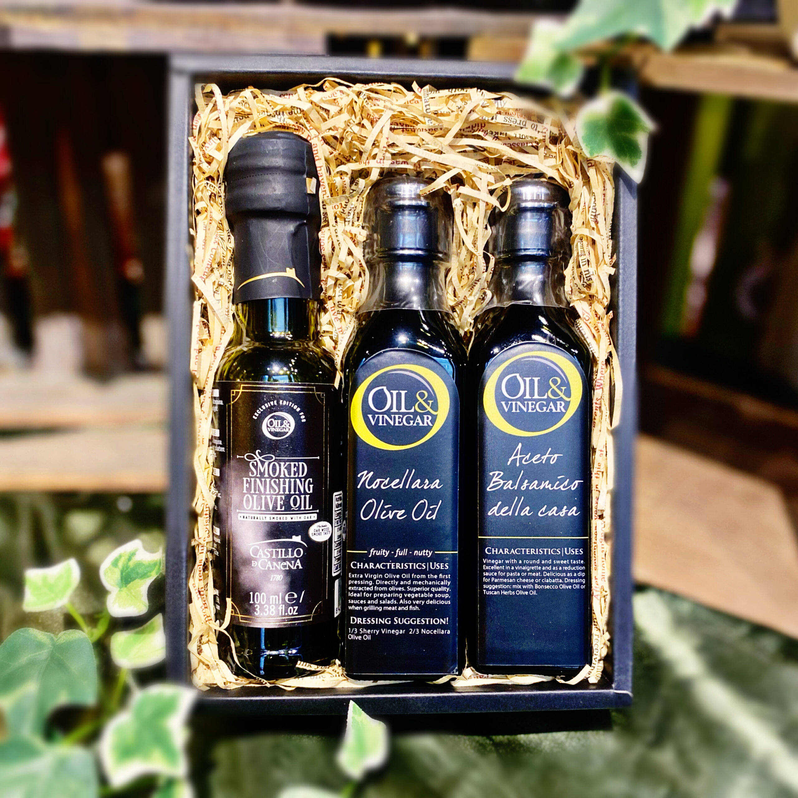 セット内容: ノチェラーラ 120ml、アチェート・バルサミコ・デラ・カーサ 120ml、スモークドフィニッシングオリーブオイル 100ml