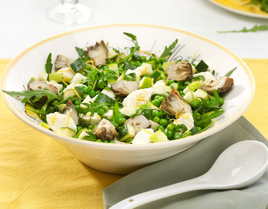 Step2のアーティチョーク、Step3のズッキーニとネギ、グリーンピース、ルッコラ、リンゴをお皿に盛る。